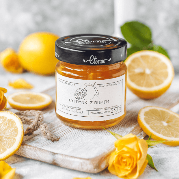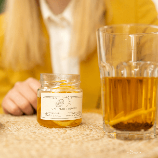 Cytryny z rumem. Przygotowujemy je z najlepszych, wyselekcjonowanych cytryn, rumu i cukru. Nie są rozcieńczone wodą. Skład jest prosty i krótki i nie ma nawet odrobiny konserwantów. Proces wytwarzania jest pracochłonny i długotrwały co gwarantuje jedyny w swoim rodzaju smak i najwyższą jakość.