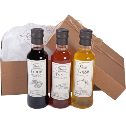 Syrop malinowy z imbiremsok z malin 45%, cukier, sok z cytryny, imbir 9% (spoza Polski).Syrop cynamonowo-karmelowycukier 51%, wyciąg z cynamonu 30% (woda, cynamon*), sok z cytryny, przyprawy. *spoza Polski. Syrop pigwowysok z pigwy 51%, cukier, sok z pigwowca, woda, spirytus. Zawartość alkoholu 0,5% obj.